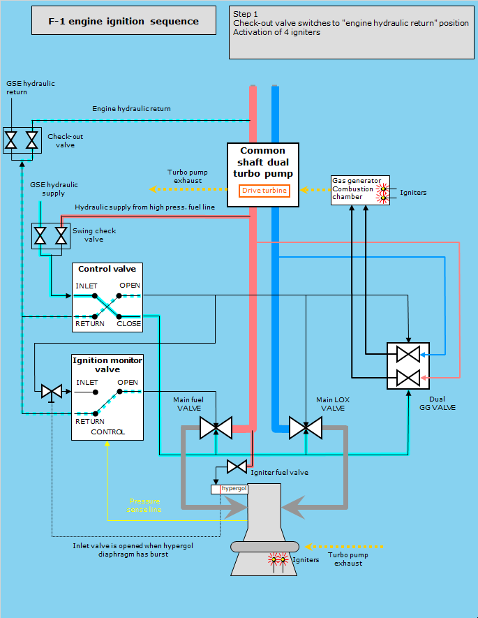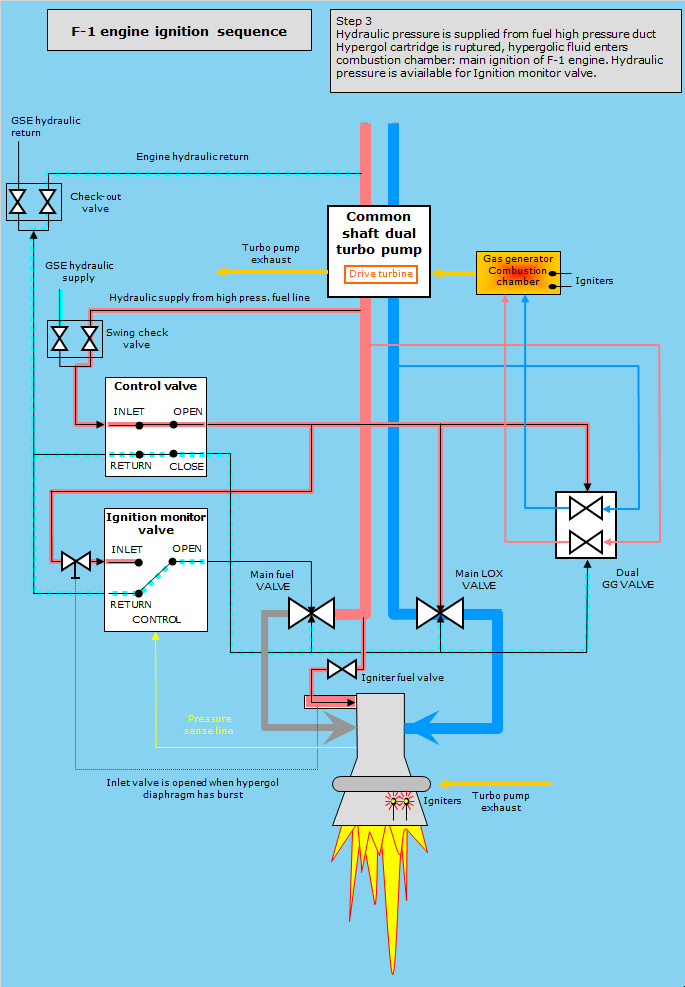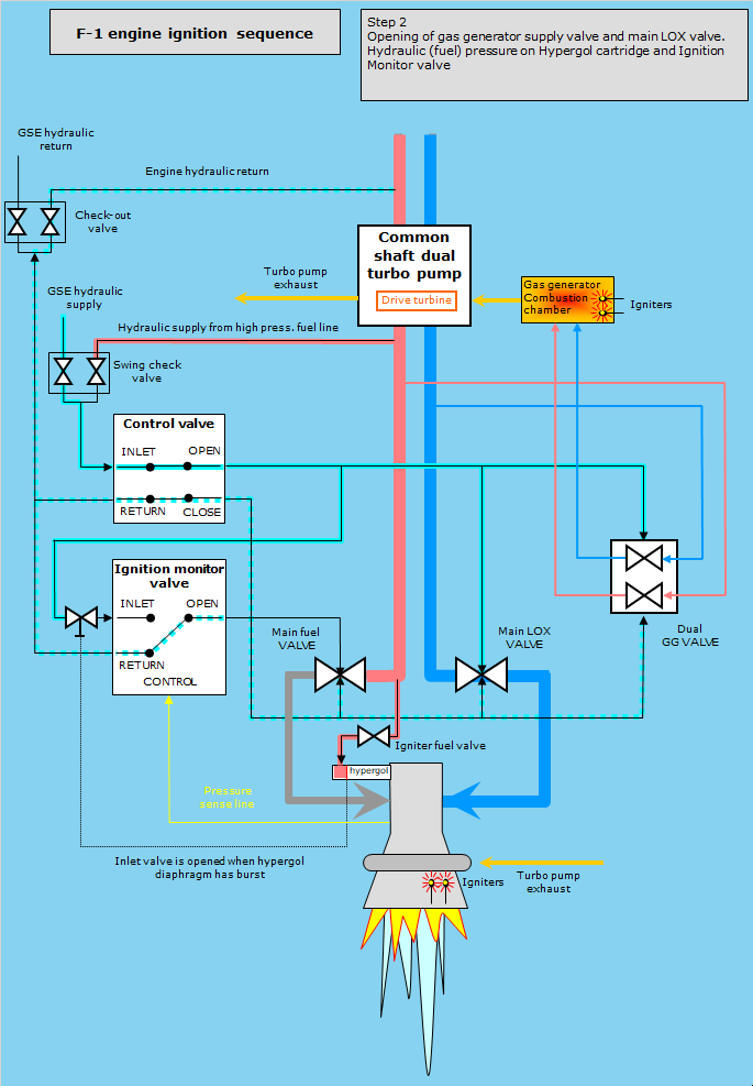 he thrust chamber of the F-1 engine is fed through two fuel ducts and two LOX ducts, each equipped with a valve. In the drawings only one main fuel line and one main LOX line are depicted. The check-out valve and the 4 pyrotechnic igniters are activated by an ignition sequencer. The next sequence of events are interrelated. The control valve, for example, is activated when the igniters have burned through electrical links.