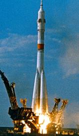 Liftoff of Soviet Soyuz vehicle from Baykonur Cosmodrome in Kazahstan; July 15, 1975