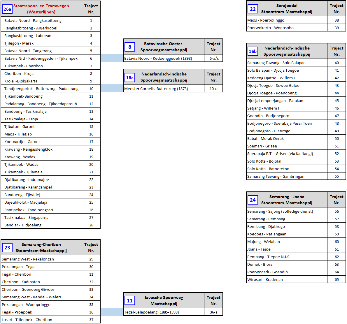 De trajectnummers in de tabellen komen overeen met die in afbeelding 3.1 met een geografisch overzicht van het spoorwegnetwerk op Java. In bovenstaand overzicht is ook te zien dat de trajecten 6, 10 en 36 werden gebruikt door twee spoorwegmaatschappijen. De trajecten 107 t/m 118 werden geëxploiteerd door automobielvervoersbedrijven die aansloten op de trein- en tramdiensten. Automobieldiensten Van den Lande wordt in bron 2 (De Regerings Alamanak uit 1920) Lands Automobieldiensten Diensten genoemd en was een onderdeel van de Staatsspoorwegen. |