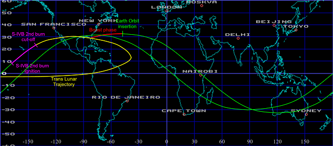 Apollo 8 ground track during Ascent, Earth Parking Orbit, Trans Lunar Injection Burn and Trans Lunar Coast