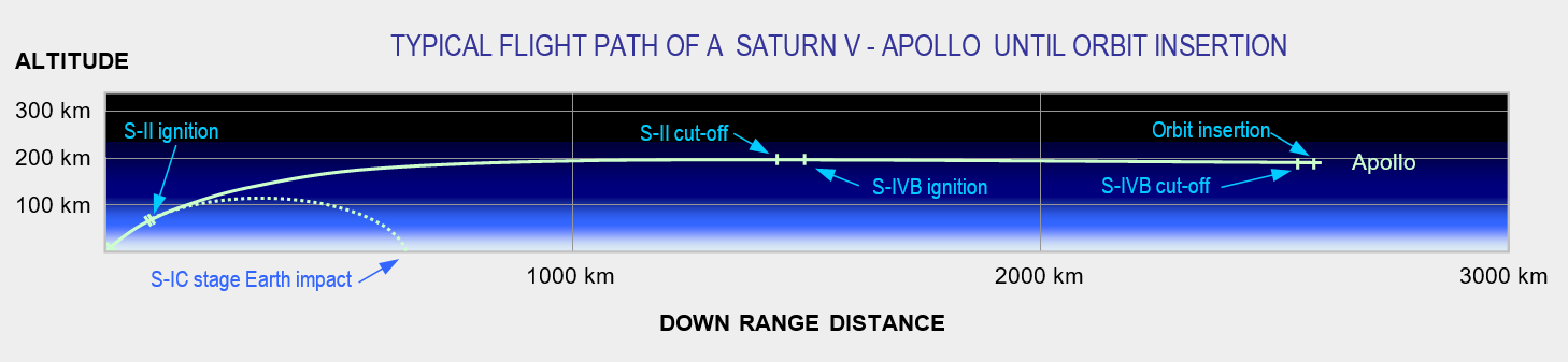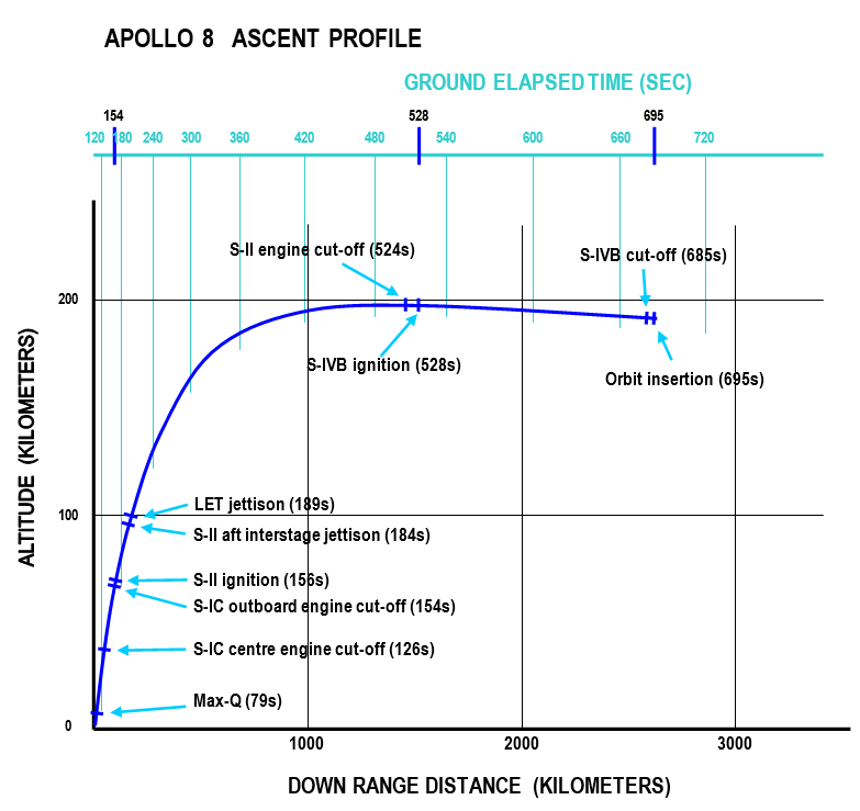 This picture shows the flight path of the SA-503 (Apollo 8) during ascent. The event sequence times are based on data listed in table 2-2 of the AS-503 flight evaluation report (ref.2). |