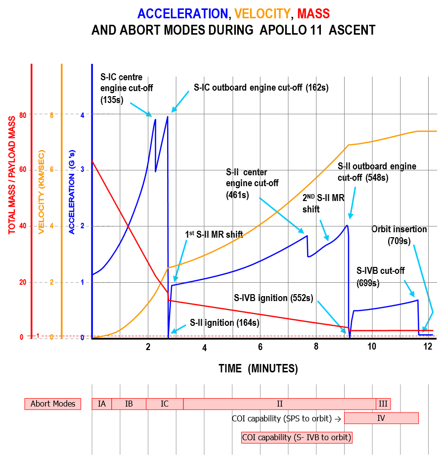 This picture shows a set of flight characteristics of the SA-506 (Apollo 11) from lift-off to orbit insertion. The mass of the whole Saturn V stack is expressed in payload mass. The payload mass is the combined mass of the command module, the service module, the lunar module and the spacecraft lunar module adapter, which is around 47 metric tons (around 1.6 % of the launch mass).