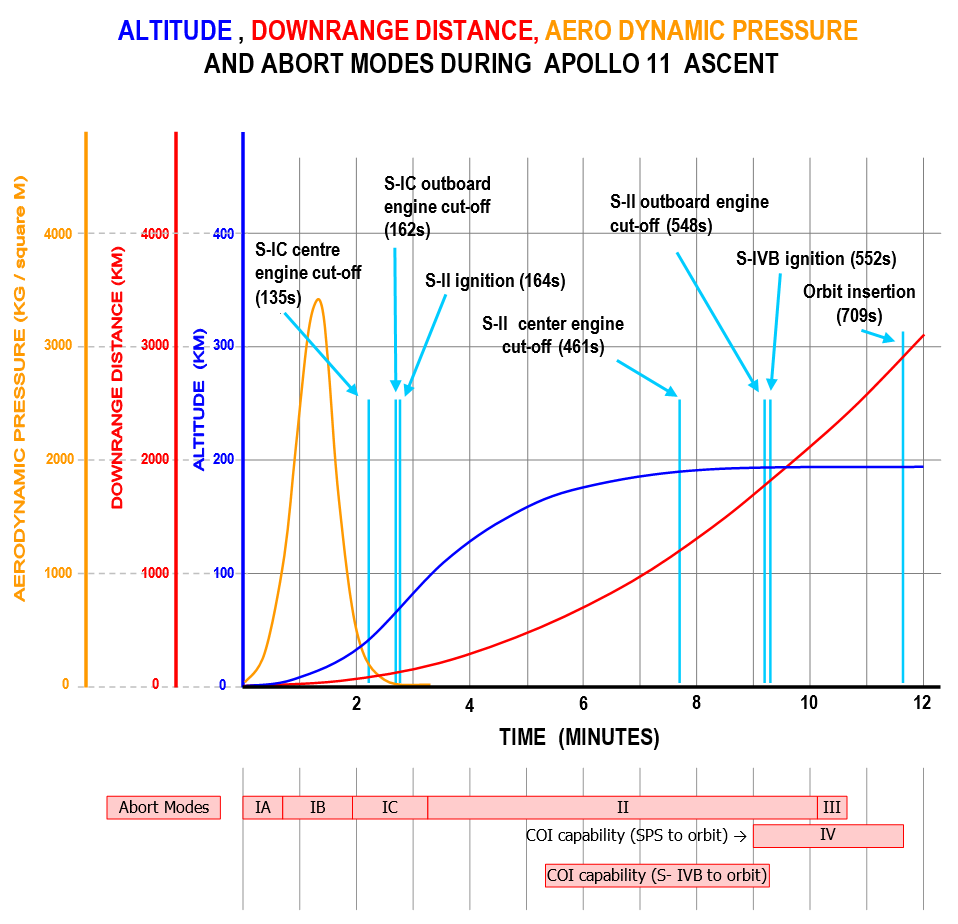 This picture shows a set of other flight characteristics of the SA-506 (Apollo 11) from lift-off to orbit insertion. Also shown are which abort procedures have to be used in time during ascent in case of emergencies.